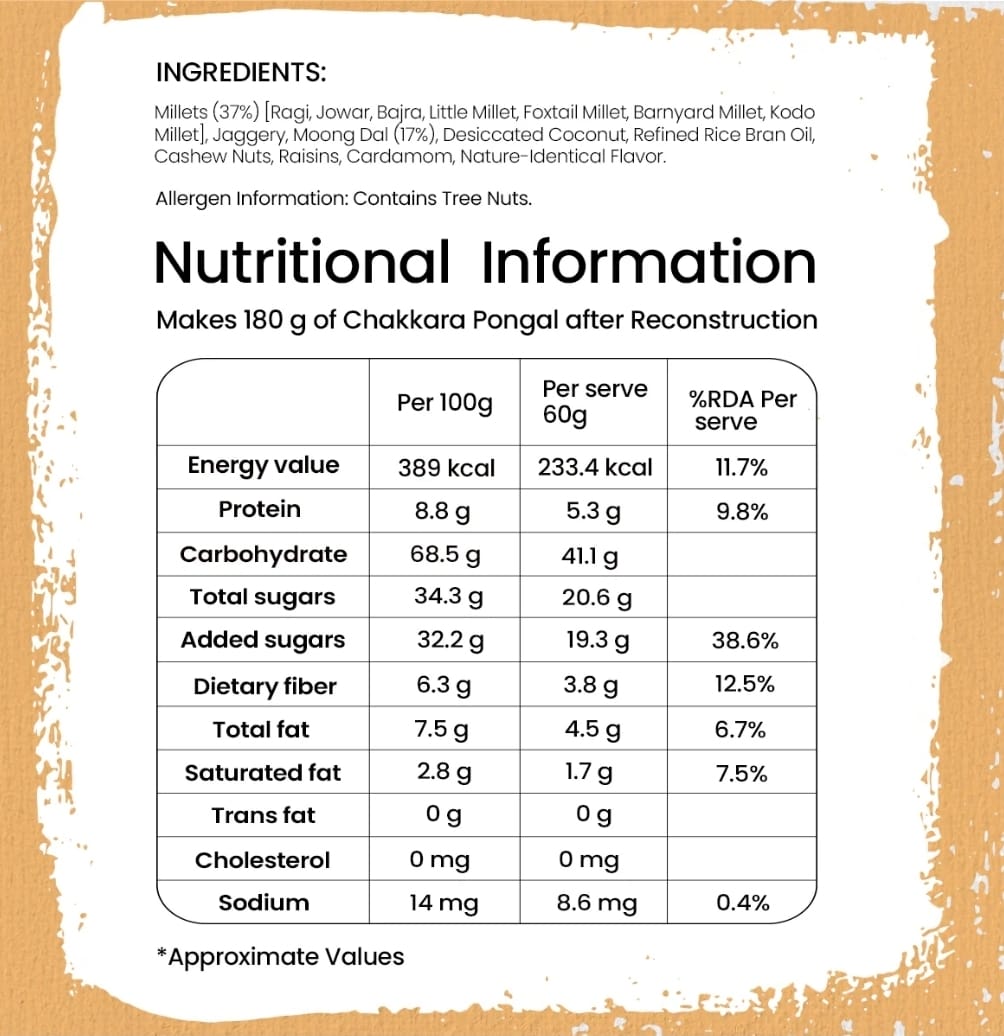 Sweet, nutty, and utterly satisfying, our Millet Chakkara Pongal is a traditional South Indian dessert made with millets, jaggery, and pulses. Enjoy a balanced, sweet treat that's both nutritious and delicious! USP Rich In Protein | Rich In Dietary Fibre | 35% Millets & 16% Pulses | Serves 1 Weight : 10 x 100g Packaging type : Single serve pillow pouch