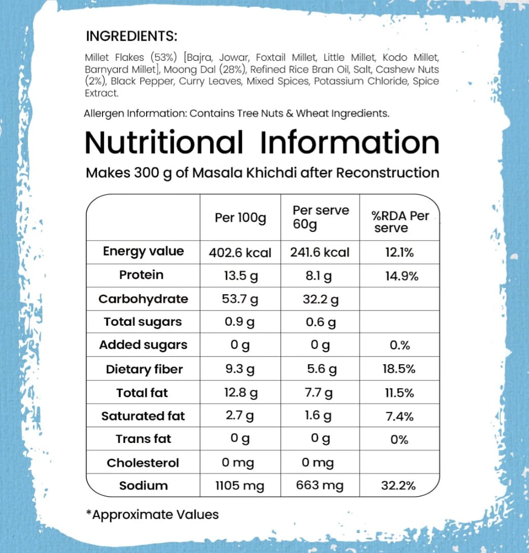 A comforting, spicy bowl of Masala Kichidi made with millets and pulses, inspired by traditional Gujarati and Maharashtrian flavors. Perfect for a quick, wholesome meal when you crave something light yet filling. USP Rich In Protein | Rich In Dietary Fibre | 49% Millets & 26% Pulses | Serves 1 Weight : 60g Cooked Portion Weight: 290g Packaging type : Single serve pillow pouch